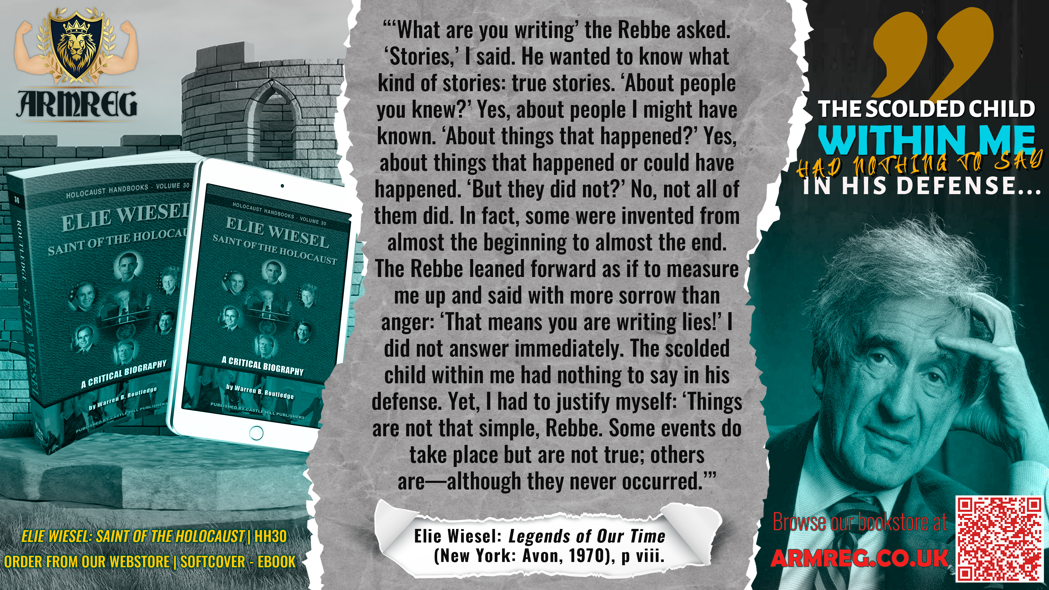 The second strand involves close readings of several of Wiesel’s published texts, with emphasis on his alleged “autobiography,” the novel Night. The author demonstrates Wiesel’s appalling ignorance of both the physical details and layouts of the Auschwitz and Buchenwald camps, and this ignorance also extends to German administrative protocols and procedures. Amazingly, the novel’s chronology of the events said to have “really happened” in the author’s life is also disjointed, confusing and internally contradictory. The author also shows the role played by the meme of “retroactive continuity” in the telling of the Holocaust story.
